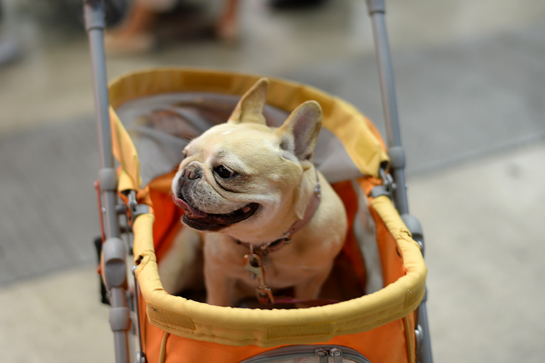 可愛いフォーン(薄茶)のフレブルちゃん発見。写真撮らせて頂きました。そそ、このくらいいいこだと連れて行けるんですよ。