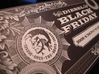 ファッションブランドDIESELの「Black Friday」なるカードを頂いた….30%OFFのディゥカウントバウチャーだ。DIESELと言えばお高いジーンズで有名なブランド、普段ユニクロのジーンズしか身に着けない私には高嶺の花だ。楽器以外は琴線に触れるグッズがないから無理してって気持ちもあるけど、せっかく頂いたのだからロケンロール野郎&バイク野郎としてはかっくい~デニム!?と天使VS悪魔IN頭になっている(笑)時期になればDIESELとてご多分に漏れずバーゲンやクリアランスを行う。当然30%以上の値引き商品もある。でも意外と季節に関係ないジーンズは対象商品となっているケースが少ない。また残り物ではないので絶対にサイズは揃っているはず。どうしよ?