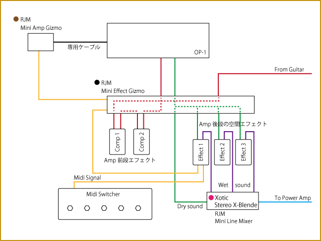 Axes CircuitのOP-1 Preampを核としたシステムの妄想。出来る事ならOP-1とパラレル接続した空間系をとりまとめてMidi信号で一括管理したいところである。PreAmpのチャンネル切り替えにはRJM Mini Amp Gizmoで対応出来るのかが鍵となるのだが、仮にそこがクリアー出来ればRJM Mini Effect Gizmo及びRJM Mini Line Mixerや手持ちのXotic X-Blenderを使用することでシステムが組めそうな感じである。 続きを読む