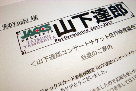 なんとワイフが駄目もとで応募した山下達郎さんのコンサートに当選した。イェイ!!以前は何度も電話チャレンジやハガキ応募を繰り返し最後の最後奇跡的にハガキによる応募でプレミアムチケットを手に入れた。なんでも当選したその日は芸能関係者席無し、ファンクラブ優待無しのガチンコ席取り合戦の公演だったとご本人がMCでおっしゃっていた。しかし今回はなにげに応募しての当選…そんなもんなんだろうな。4月の中野サンプラザでの公演なのだがこれはラッキーなのである。