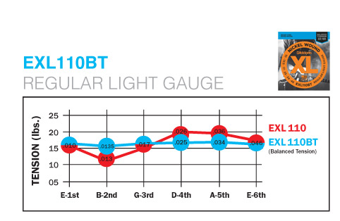 通常の.010~0.46とBalanced Tension Stringsの違いは下の通り。B弦が太くDとA弦が細くなっている。テンションも殆ど揃っている感じ。」