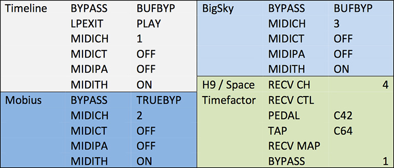 それぞれペダルのGlobalセッティングで設定(他Midi設定も下図の通り)して各機器をMidiケーブルで接続。