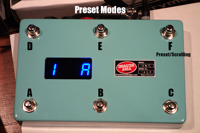 [Presetモード]はディスプレイ左に数字(Bank)が表示されます。A・B・D・Eボタンが各パッチスイッチになります。バンクは30まであってFスイッチがバンクアップ、Cスイッチがバンクダウンとなります。因みに30の次は1に戻ります。