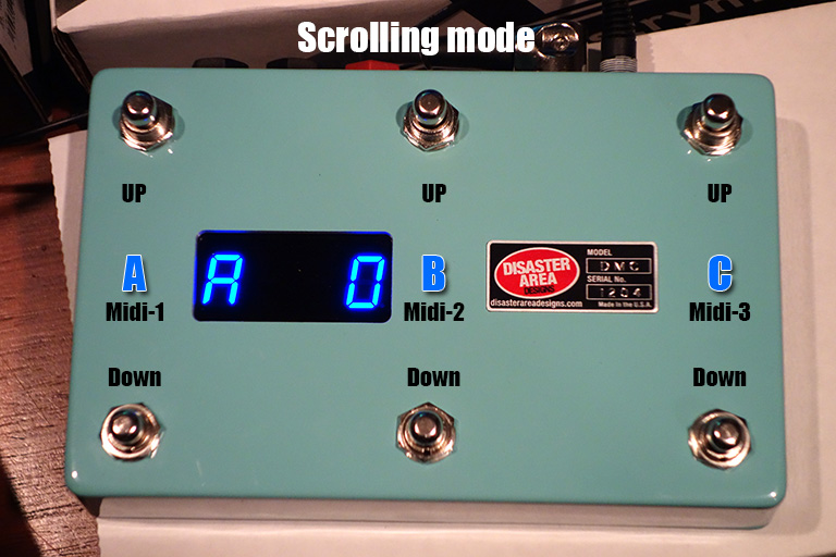 下写真はAに接続したMidiペダルをスクロールしてパッチを切り替えている状態です。Aの1DownでBypass、1Upで上のパッチ。