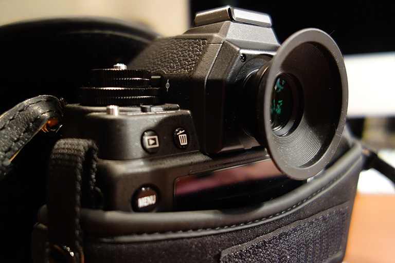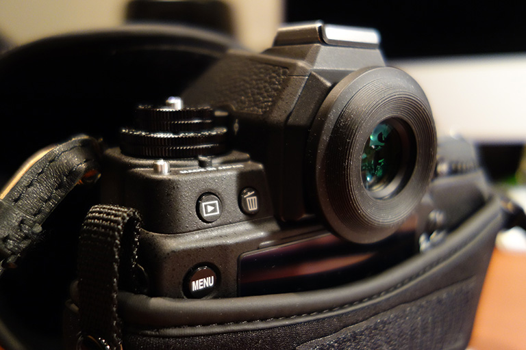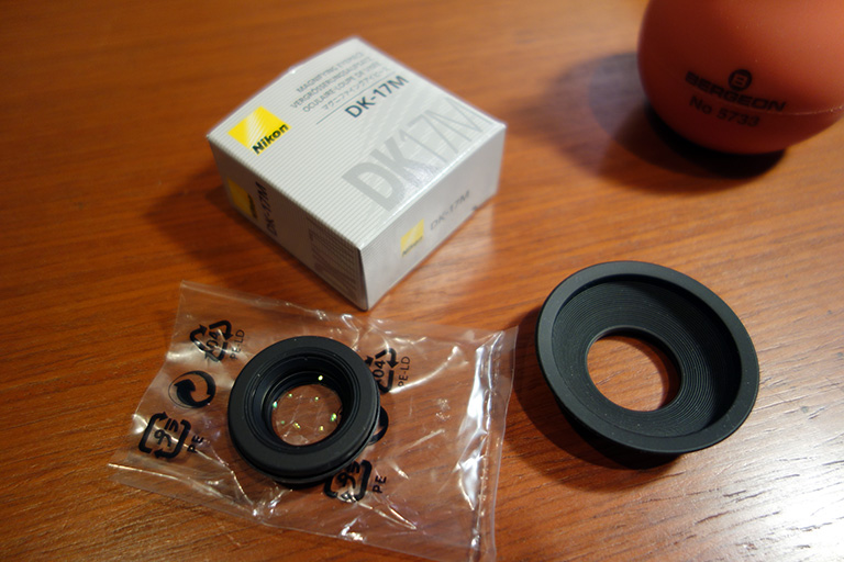 接眼部分に目が直接触れないようにラッパ型アイカップの接眼目あてDK-19とファインダーの倍率を1.2倍にするマグニファイングアイピースDK-17Mを購入。