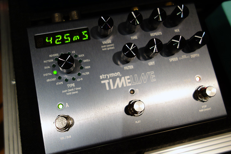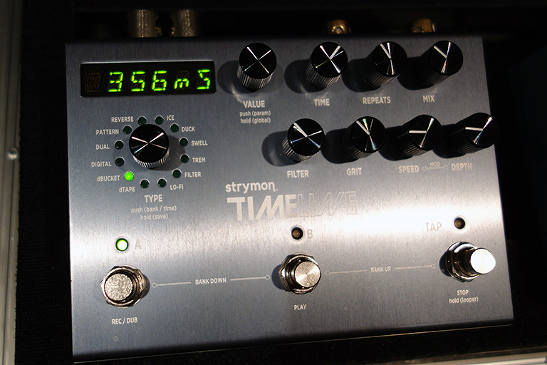 アルゴリズムはDigital Delayで各ツマミは写真の通り。画像ではロング寄りディレイですがEXPやTapでTimeを可変してる場合もありますのでどのように使っているかは分かりません。またこのアルゴリズムは内部パラメーターとしてリピートのアタック音を調整できたり、HiPass、通常より大きなカーブでリピート音が消えるRepeat DynamicsのOn/Offがあります。ですのでランドーさんと全く同じっていうのはWeb画像だけでは無理ですね。ただし参考にはなります。今回はバンク50の01(アタックOFF)・02(アタック50%)でセーブしました。