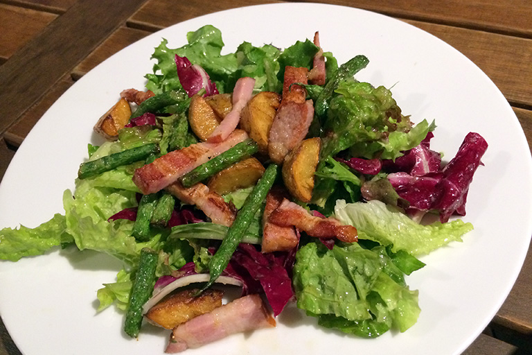 ツマミとしましては上の写真の「リエージュ風サラダ」ベーコンの塩っけがグリーンに合います。芋のほくほく感も良いです。こちらはベルギーです。