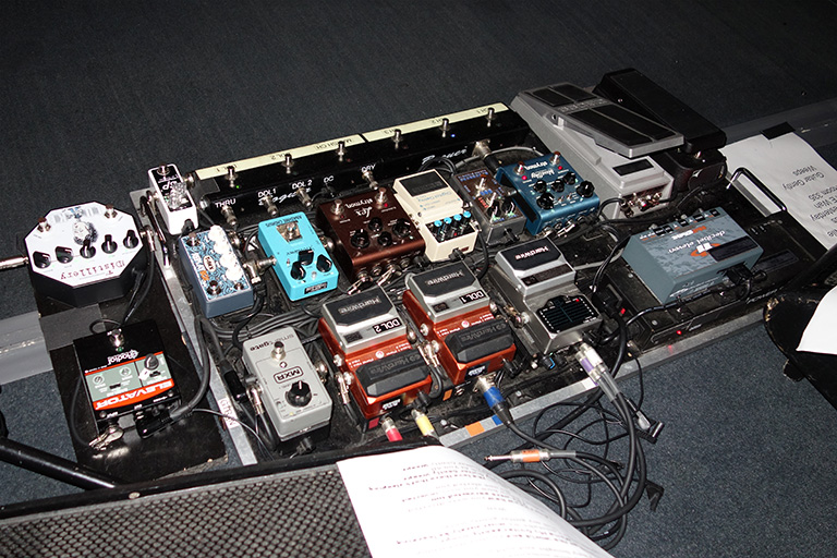弾駆動は使ってませんでした。コーラスをかけた空間系クリーン以外はほとんどDrive Ch& Boost ONでプレイしてましてHilton Volでクランチ〜OverDriveをコントロールしてました。Wahは殆どつま先寄りの操作が多かったかな。ディレイの設定は意外とリピート回数が多いです。曲が終わっても結構長い事繰り返してました。TCコーラスは相変わらず美しい…3way出しって事もありますね。やはり原音が崩れません。ラリー先生の唸るドライブサウンドを久々聞きました。