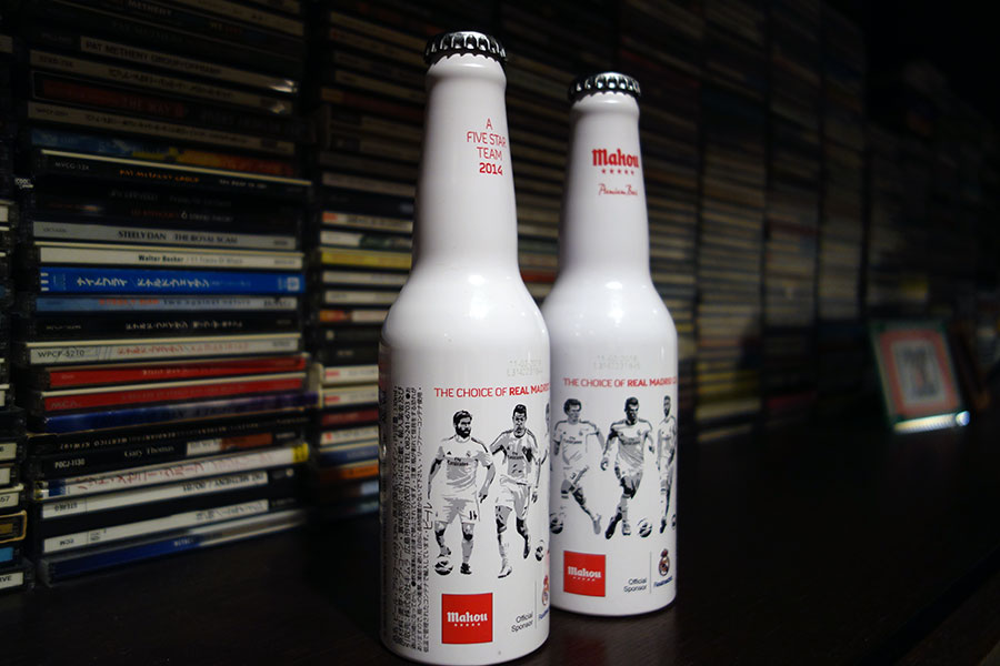 マオウ・シンコ・エストレージャスのレアル・マドリードC.F. 特別限定アルミボトルなんだとか。ソニプラで発見です。ボトルにはシャビ・アロンソ、クリスティアーノ・ロナウド、イスコ、イケル・カシージャス、ペペ、ガレス・ベイル、セルヒオ・ラモスの7人のスター選手のイラストが描かれてます。マオウビールってスペインを代表するビールなんですね。