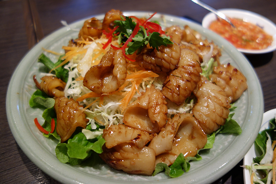 続いてメニューの能書きから多分行けそうと判断したイカの網焼き、スパイシーソース添えプラームック・ヤーン。プラーって名からもしかしたらナンプラーたっぷりか?と、思いましたが香ばしく焼いてあったので魚醤の風味はありませんでした。よく中華であるようなイカの炒め物って感じでした。少しイカ本来の味が薄く感じましたが普通に美味しかった。