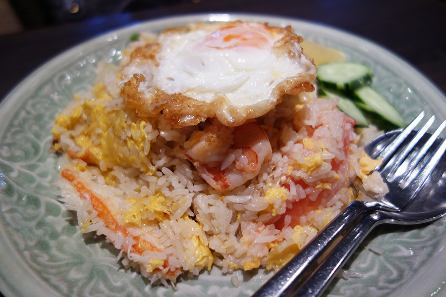 ワイフのメイン、なんとか食べられそうだったタイ式シーフード入り焼き飯、フライドエッグ添えのカオ・パッ・タレー。海老&カニチャーハンですね。これは美味かった。