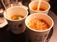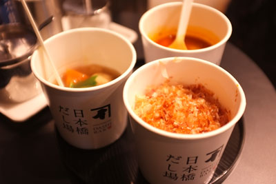 COREDO日本橋からほど近いところに出来たCOREDO室町へ立ち寄った。1Fには刃物の老舗木屋さんが入っていた。もともとは単独店舗だったので再開発に参加したかたちなのだろう。その隣に鰹節の老舗「にんべん」がアンテナショップを出店していた。商品は勿論なのだが入り口ににんべんの出汁を楽しめる「日本橋 だし場(BAR)」を併設。小腹が減っていたので立食した。注文したのはだし汁を使った「練馬大根と肉団子の春雨スープ」と「肉だんごときのこのトマト仕立てスープ」、それに鰹節がふりかかった「かつぶしめし」である。さくっと良い感じの和であった。おいしゅうございました。