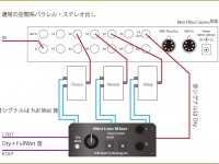 通常は上左図のように接続する。入力された信号をS1-Chorus、S2-Delay、S3-Reverbなどとして、各エフェクターからのFull Wetでのステレオの返りをMini Line Mixerへ、またSC Outか通常のOutからのDry音をMLMへ入力してミックス。ステレオアウトするのである。なので各エフェクターからDry音が出るのは御法度。
