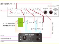 今回は右図のように接続して試してみた。S3-Reverbの返りも(Full Wet音のみ)直接Mini Line Mixerへ、今回は接続しなかったがDelayもReverb同様な接続(Full Wet音のみ)。