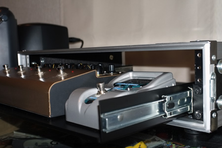 測るとトレイ底板上部から2Uラックまでおよそ8.8cmあった。これだけあれば大概のエフェクターは搭載可能だろう。写真は大きめのエフェクターYAMAHA AG STOMPとPETERSON STROBO STOMPを乗せた図。余裕だよね。