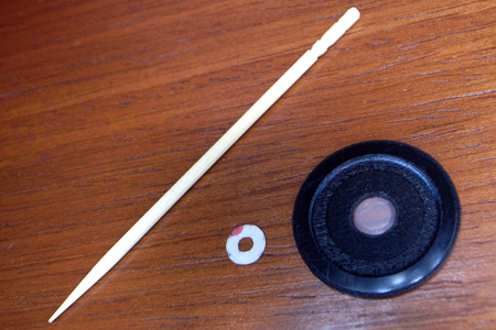 本日到着したので早速取り付け。上写真がそのMENU BUTTON SOLUTIONなのだがプラスチック製ガイドリングが付いたシール(中央白部分、その他はガイドリング)と楊枝のセットであった。そのネーミング通りの品物で満足(爆)