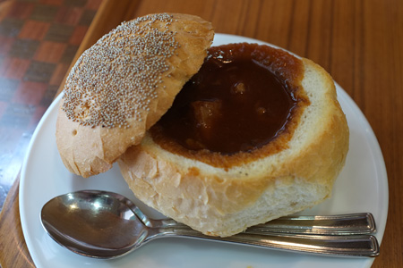 レジで注文すると奥の工場でブール形フランスパンをくり抜き続いてレジ横の保温器からシチューをその穴に注ぎ込んで出来上がり。