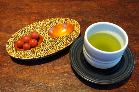 さてさて、8時に約束しておいたお宿のお楽しみNO.3…朝食タイム。和・洋と選べるのだが夫婦揃って「和食でっ!!」となりました。小梅ちゃんと熱いお茶の後は宮ノ下豊島豆腐店の吟遊専用ゴマ豆腐。塩とたれ醤油でいただきました。しおがいいねぇ…絶品だ。