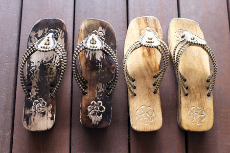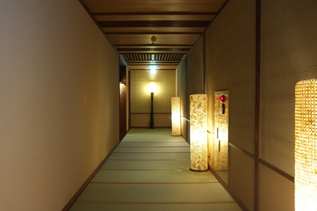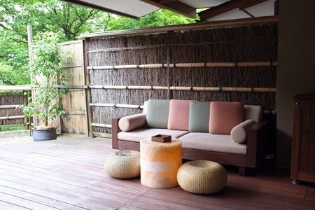 そのテラスへおりる下駄…お洒落。露天風呂上がりに濡れたままでもOKなソファー。テーブルが電飾入りで夜にはやわいオレンジ色に。