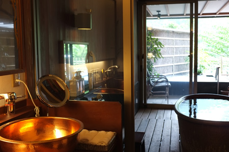 ざっと部屋の様子をば。Wシンクの洗面台…いちいち芸が細かい(笑)その洗面所から内風呂そして外風呂へと続く。外風呂は部屋からも直接行けるけどね。