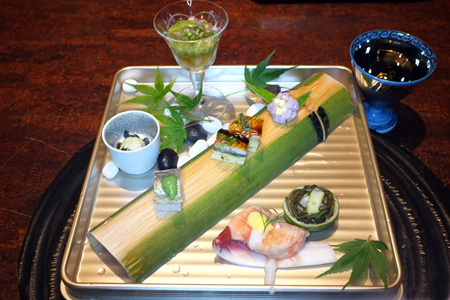一皿目は「旬彩」各種。岩茸湯葉浸しが特に美味だった。一の椀「香り」油目の薄葛仕立て。