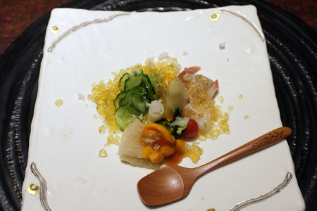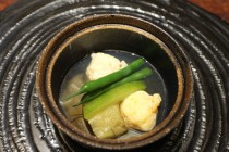 「海の恵み」本鮪はもちろんだがシマアジ・まきエビも美味!!一皿目もそうだが丁寧、そして可愛らしい繊細な盛りつけだった。ハナマルキュウリ(この写真じゃちょっと分かり辛い)の添え物がまたお洒落。そして「愛肴」エビとホタテのつみれ餡かけ。