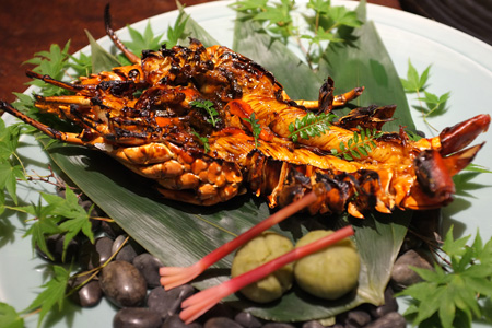 続いて別料理でたのんだ伊勢エビの焼き物。グラム売りで小さいのを注文したのだけどこの大きさ。うましでした。うぐいす色のはずんだ餅団子。