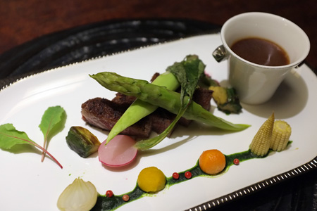 続いてコースのメインディッシュ「洋彩」ふじやま和牛のグリル。写り、見た目とあまり良くなかったのだが食べてビックリ!!いい具合にあぶらがのっていて、久々にうまいステーキ食べました。続いて「止肴」北寄貝の炙り酢の物。この頃にはかな〜りお腹がぱんぱん。