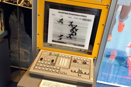 診察を待ってる間近所を散策、SEIKO MUSEUMってのを見つけた。入館料が無料だったので覗いてみた。服部時計の歴史は勿論歴代の時計がズラリとならんでいた。それこそ壁掛け時計からGRAND SEIKOまで。小学生だったころ時計屋のウィンドウに釘付けになった腕時計もあったかな。ゼンマイの仕組みクオーツの仕組みなどの解説も懇切丁寧にディスプレイされていた。陸上のスポーツタイマーとか水泳のタッチ式タイマーそして写真のビデオカメラ判定なんてのもあった。なんでも今年4月にリニューアルしたばかりなんだとか。