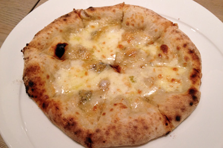 何と言ってもベーシックなマルゲリータ(上写真)、それにぷりぷりエビのシチリアーナなのだが、〆に4種のチーズのフォルマッジに蜂蜜でスイーツピッツァが好み。(下写真)