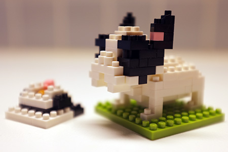 nano block ワカダのnano blockシリーズのフレンチブルドッグ・パイド(白黒種)。ジュニア2号が仕入れてきた。何故フレブルが…メジャーになりつつあるのかな?作ってみると身体にも黒の模様が入っていたのだがうちの子は身体は真っ白。そこであまったブロックを使って作り直し。細かいので目的のブロックだけを取り除く事が出来ずイライラ、結局一からなりなおした(^^; 結構似てるんでやんの。隣のはFood Bowl。