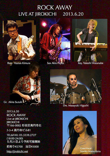 高円寺Jirokichiにおいて師匠がバンマスになっている?Rock Awayの3rd Liveであった。会場には友人の主審さんとshinさんがcont師匠最前列別名かぶりつきを陣取ってました。私はワイフと。本日の舞台セッティングはキーボが離れ小島になってまして丁度その境目あたりの席で楽しみました。のっけから難曲で始まったステージは凄まじいばかりでこちらも緊張します。