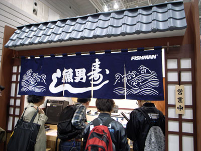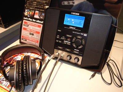 メジャーなBOSSのブース。以前当ブログでも取り上げた理想のギター練習マシンe-Bandだ。試奏用に2台置かれていたので早速お試し。写真でも分かるように意外とスペースをとらない筐体だった。ヘッドフォンでプレイしたのだが、思った以上に気持ち良く弾ける(^^;)結構な数のバッキングが入っており速度やピッチを変える事が出来る(Key変更)ので便利この上ない。またお気に入りのエフェクターがある場合は本機に接続前にチェーンしておけば自分の歪みで練習&録音が出来る。