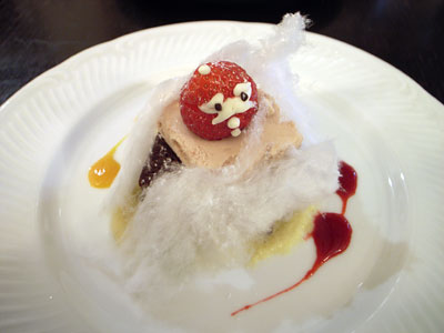 Dolce:アングレーゼに浮かべたチョコレートケーキとイチゴのムースのクリスマスツリー仕立て