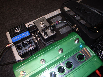 スイッチャーで切り替えも仰る通りの使用だったと思います。TS-9はそのとおし!!…ほとんど新品の筐体でした。PH-4関しましては何とも言えません…白いやつですよね?…LONGってラベルが貼ってありますので多分ディレイだと思います。ルークフリークの方々が最前列に陣取っておりましたので良く確認できませんでした。この写真も隙を見てササッと写したものでございます。長居すると怒られそうで(^^;)