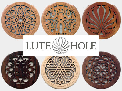 とは別にLUTE HOLEと言うサウンドホールカバーを見つけた。デフォルトでデザインが15種類(フィードバックの強弱で選べる…写真でお分かりのように完全にホールを塞ぐのではなく彫刻により穴が開いている。その大小でフィードバックと音量の丁度良いものを選ぶようになっている。)