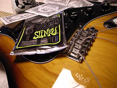 10〜46を張っているのだが二巻き戻すと4〜5度に一度決まって1弦を切ってしまう…運が悪いと2〜3度に1度。今日はその日だった。6弦側のテンションと1弦側のテンションを考えて少しずつ緩めているつもりなのだがどーしてもぶちっとしてしまう。緩め方が間違っているのか?…何年経っても下手である。