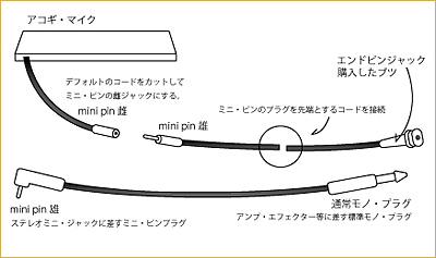 なのでギターのストラップピンの穴より、まずミニジャック(雄)付きのコードを通してそのまま購入したピンを穴に固定、サウンドホールにてマイクのジャック(雌)に差し込むって事です…なんか説明下手ですんません。